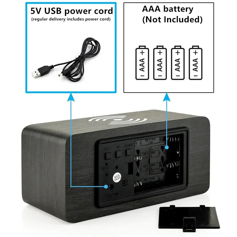 Wireless Charging Wooden Alarm Clock with Digital Display & LED